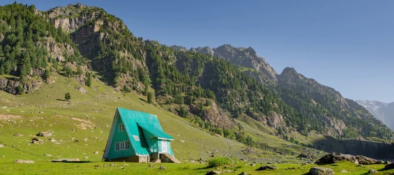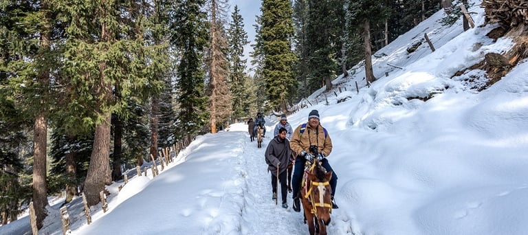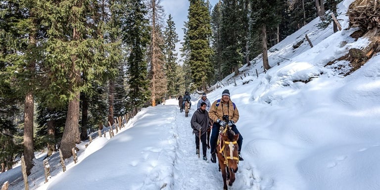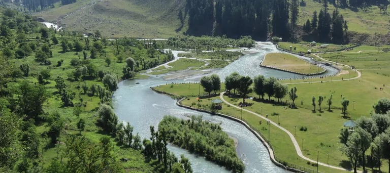 At 2,200 meters (7,218 ft) in the Anantnag district of Kashmir, Pahalgam is a picturesque valley on the banks of the Lidder River. Located about 90 km (2–2.5 hrs) from Srinagar International Airport, Pahalgam is a favorite for its lush meadows, pine forests, rushing rivers, and snow-capped peaks. It is also the starting point for the Amarnath Yatra and the famous Aru & Betaab Valley treks.