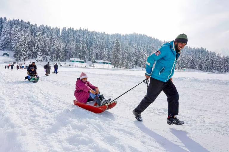 Sledge rides are widely available across snow-covered slopes in the Gulmarg winter region.